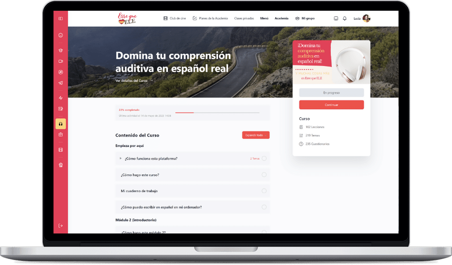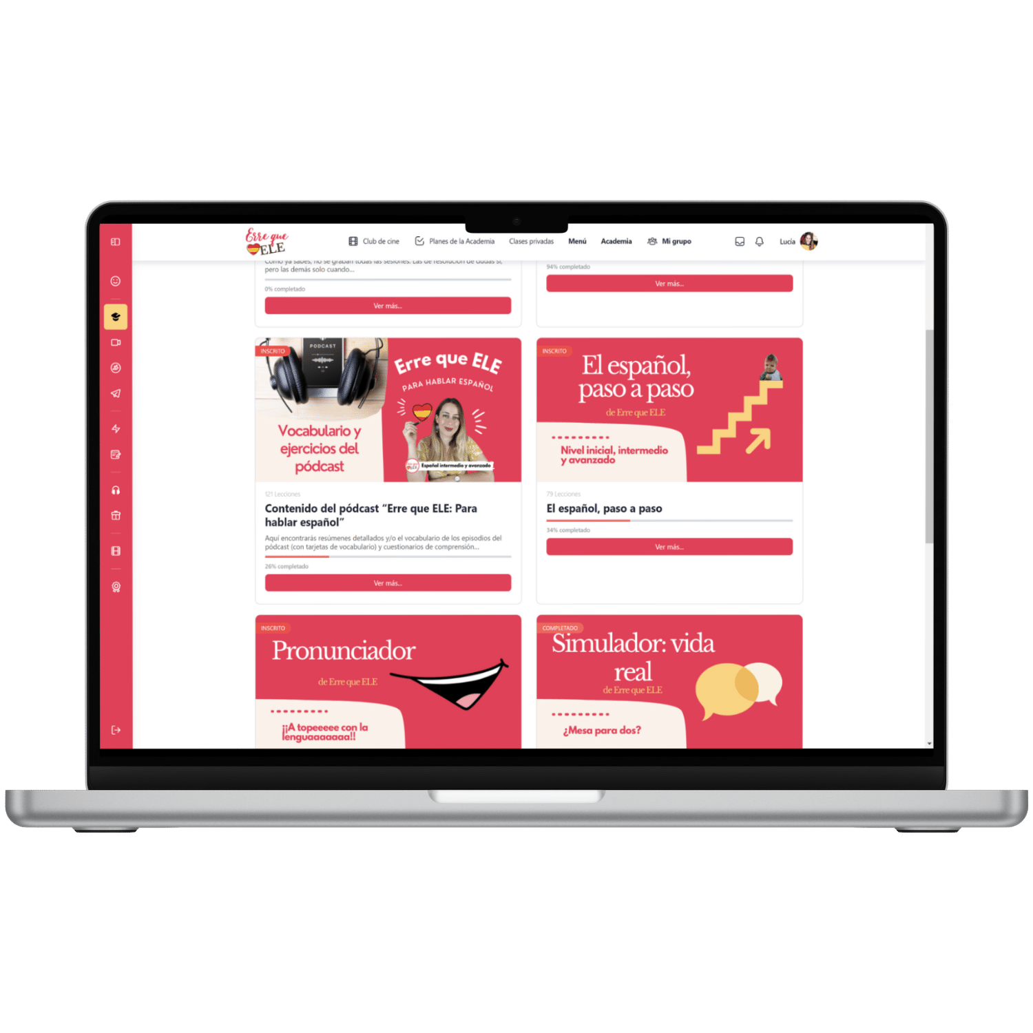 ¡Aprende y practica español a tu ritmo con los 9 cursos que componen la Academia y sus clases en vivo! Nueve cursos llenos de lecciones, temas y cuestionarios para que tengas algo que hacer siempre que quieras: tranquilamente en tu casa o incluso en una cola en el supermercado. ¡Y con clases en vivo también por si te apetece practicar tu expresión oral y resolver dudas!