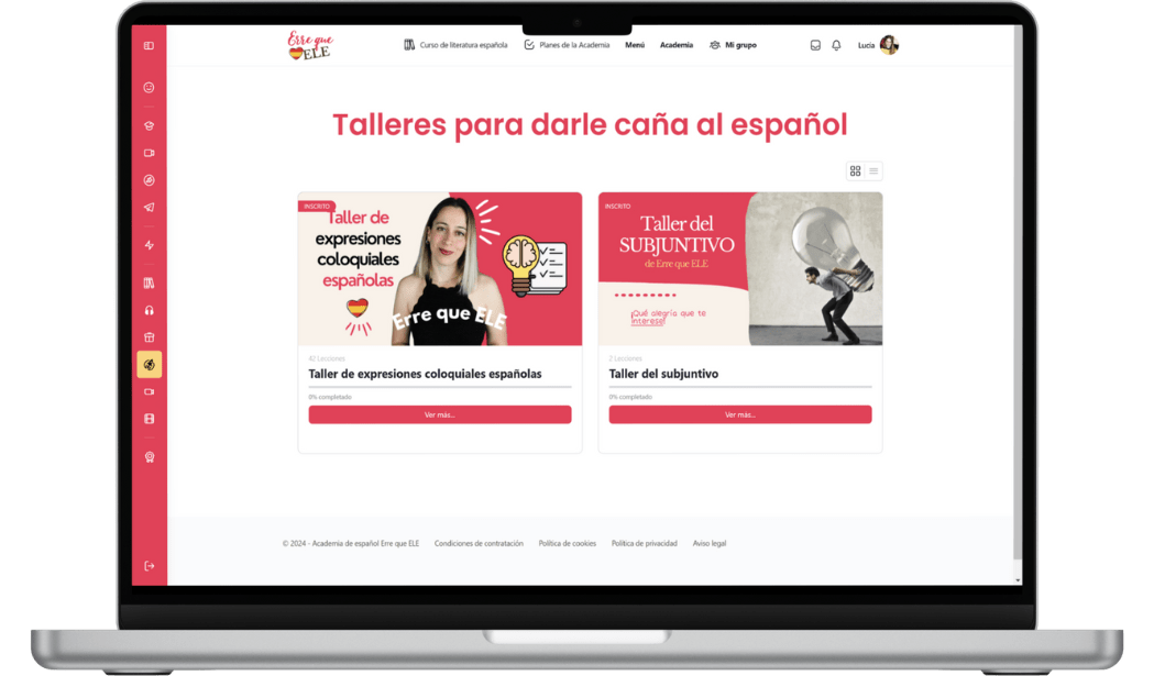Aquí tienes disponibles las grabaciones de talleres que hemos hecho en vivo para que puedas tomar nota, aprender y practicar sobre temas específicos del español: por ejemplo, el taller del subjuntivo (para que lo entiendas desde la perspectiva más moderna y lógica, que es la cognitiva) y el taller de expresiones coloquiales españolas, un taller completísimo con expresiones sobre la personalidad, los sentimientos y emociones y las relaciones sociales.